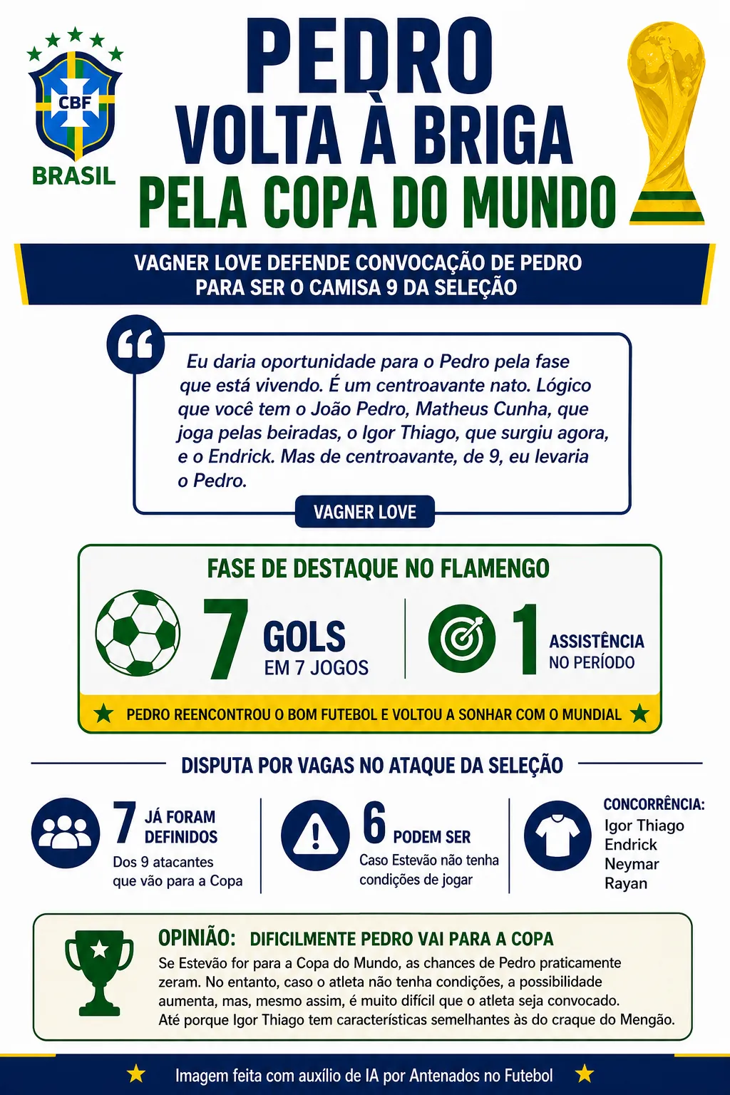 Em entrevista ao ge, Vagner Love pediu a convocação de Pedro, do Flamengo, para a Copa do Mundo, devido ao grande momento que o atleta vive. O ex-jogador deixou claro que o atacante seria o seu centroavante no torneio.