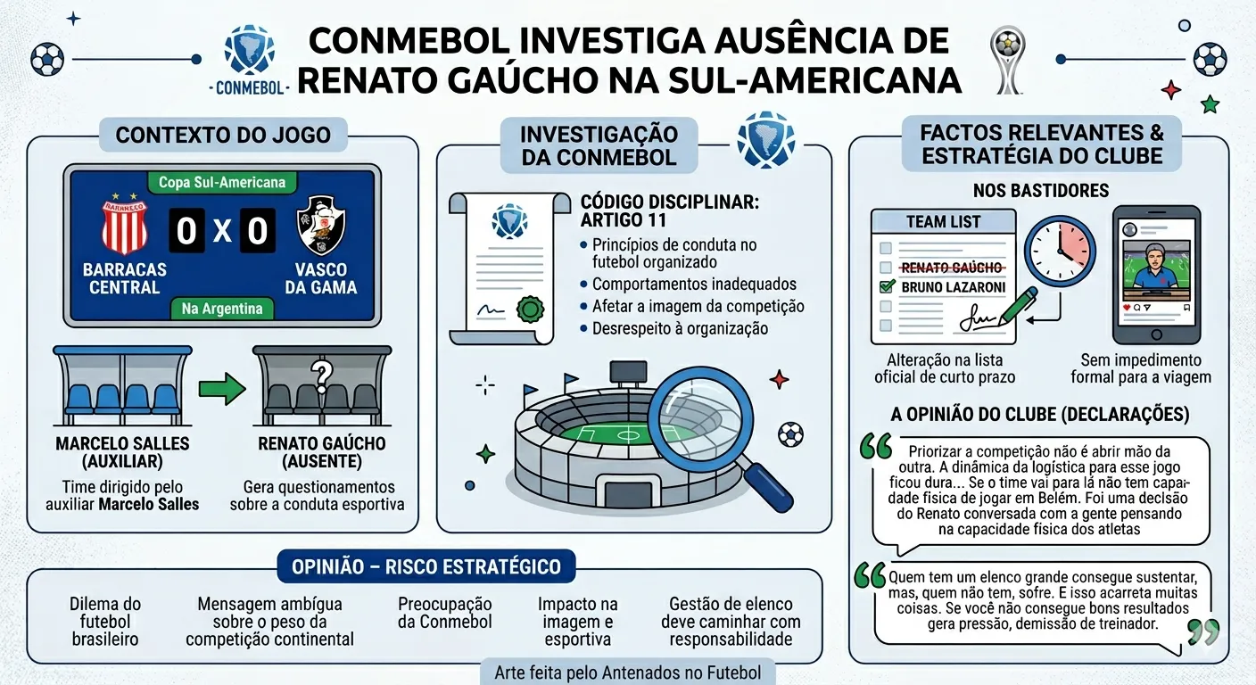 A Conmebol instaurou um procedimento disciplinar para analisar a conduta de Renato Gaúcho após sua ausência na estreia do Vasco da Gama na Copa Sul-Americana. O confronto diante do Barracas Central terminou empatado em 0 a 0, na Argentina.