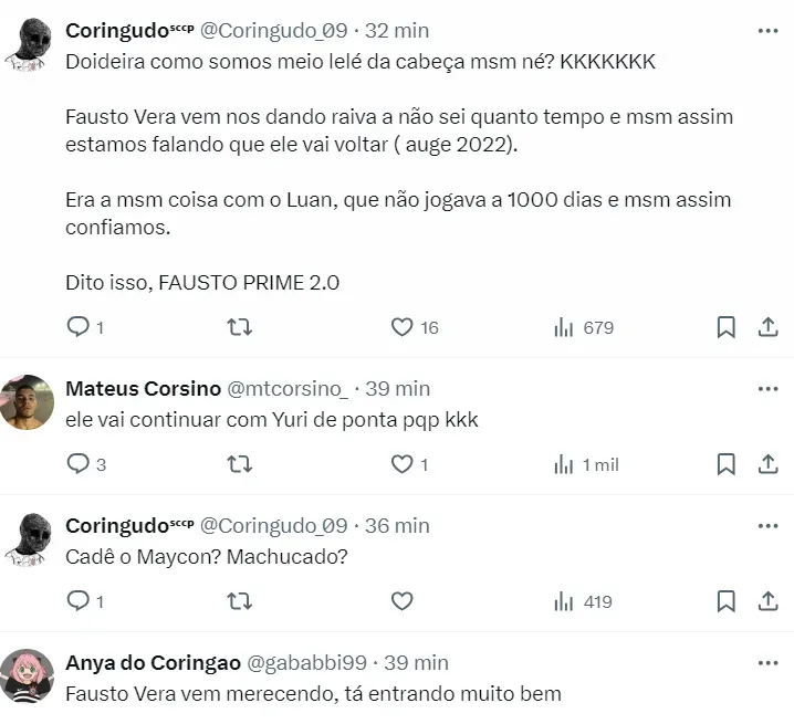 Ainda sem Maycon e com Bidon se adaptando ao time principal, o treinador pode dar uma chance para Fausto Vera, que busca recuperar espaço e prestígio no Corinthians. O argentino teve um início muito bom, mas foi caindo de produção aos poucos e atualmente é pouco utilizado.