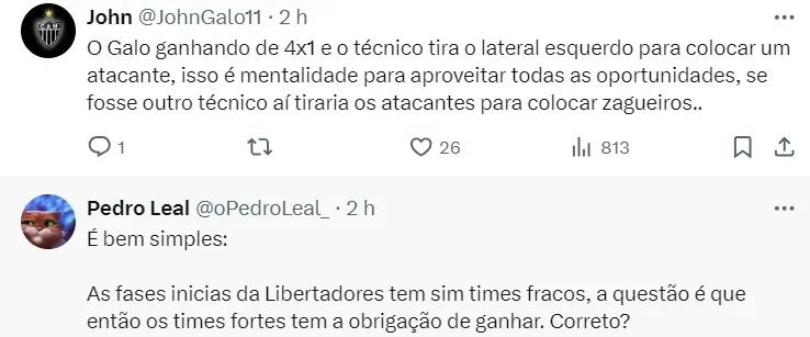 “Isso tem que ser muito treinado, ele tem dois jogos e não se pode fazer cobranças, mas isso também ocorreu na final contra o Cruzeiro, na metade do jogo quando o Cruzeiro começou a se modificar. Talvez um time que não tenha as características do seu treinador compreendidas, acho que nem teria como, demonstra uma certa dificuldade em responder à mudança de postura do seu adversário”, completou.