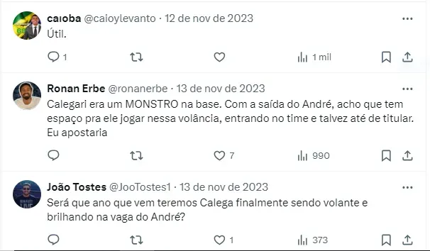 A previsão é de que o lateral-direito, esteja 100% no início de maio. Calegari retornou ao Brasil em novembro de 2023 para tratar a lesão no joelho. O clube norte-americano não quis comprá-lo devido a sua contusão séria, o atleta foi eleito o melhor de sua posição na última temporada
