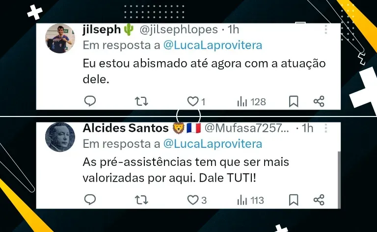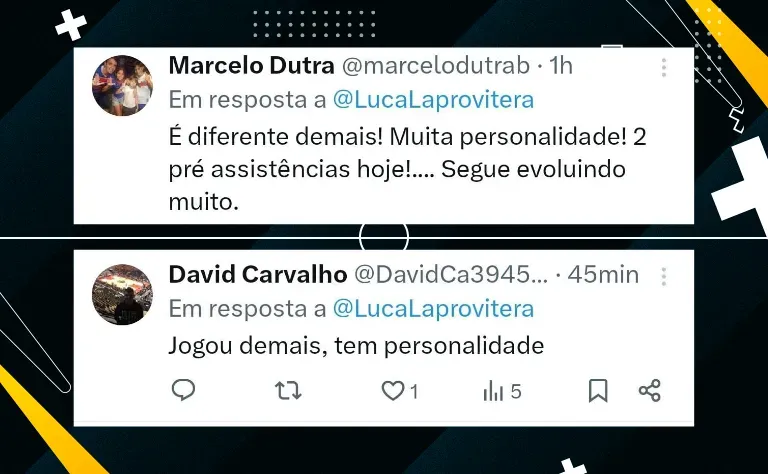 “Visão de jogo absurda, muitos bons passes inesperados… que os comuns da bola tocariam de lado. É ele controlar a afobação (normal da idade) q esse cara vai muito longe, tá tudo ali… é ser mais frio e ganhar mais corpo”, corroborou Iggy ᶠᵉᶜ (@ezpziggy).
