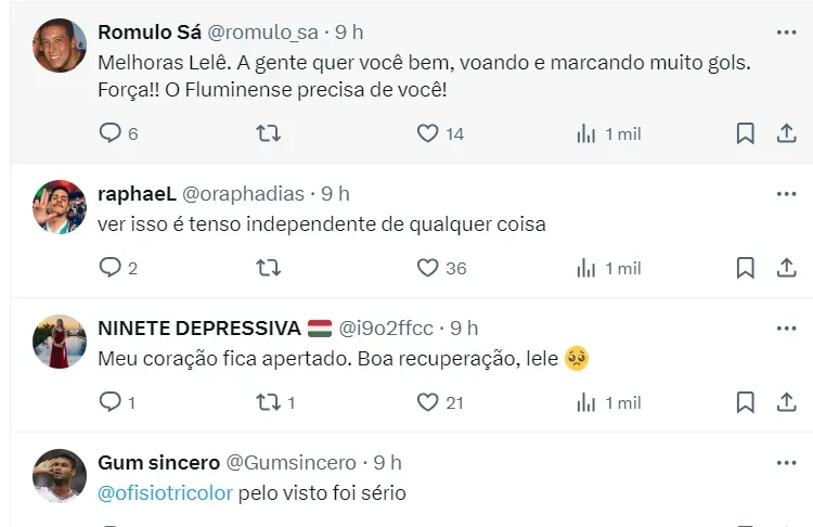 Já no fim da partida, Lelê tentou uma arrancada, no mano a mano com o zagueiro adversário. No entanto, o defensor foi mais rápido e na dividida o jogador do Flu levou a pior. Rapidamente, foi possível notar que era algo mais sério, pois logo que o médico se aproximou para o atendimento já fez o sinal de substituição.
