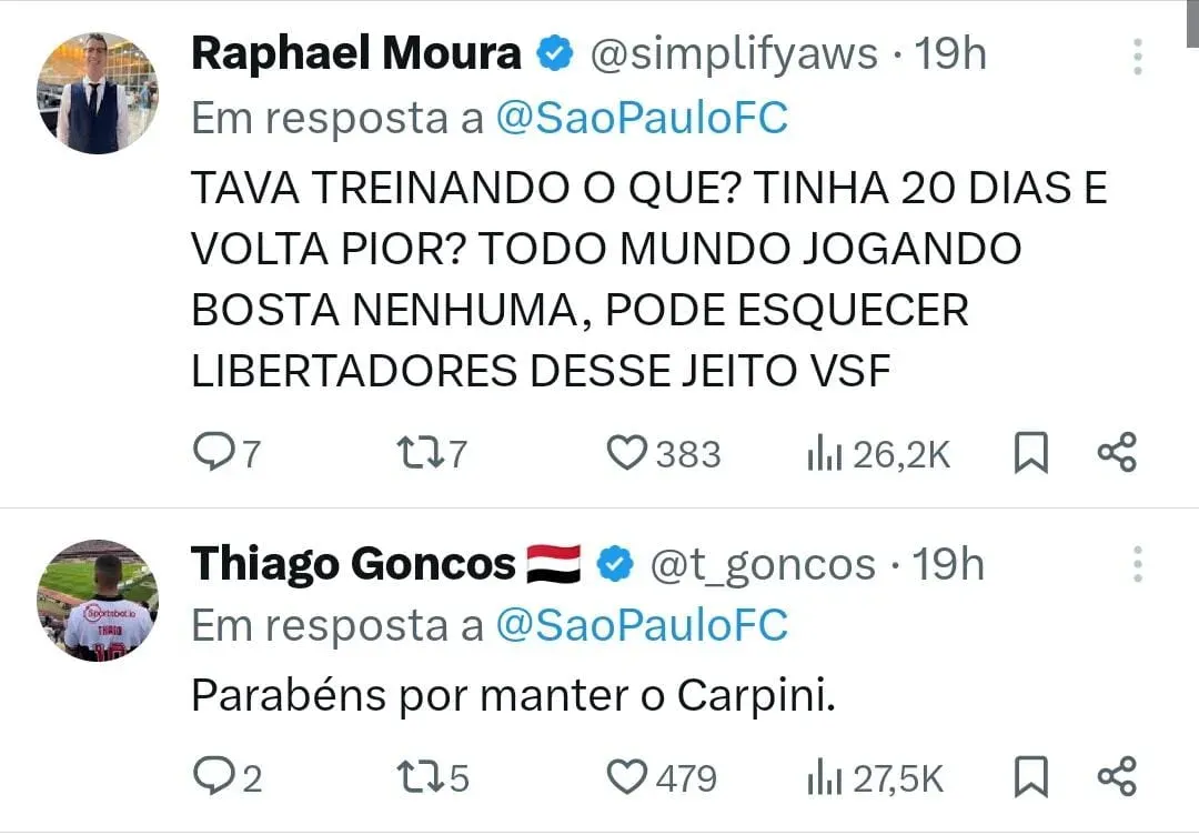 “Então, ele se viu diante de uma decisão que ele tinha que tomar, tomou e ele deu azar ali, mas o Talleres não é um adversário fraco, não é um time ruim, é talvez o pior adversário do São Paulo nessa chave. Então, o resultado não é um desastre, é aceitável, ainda mais nessas circunstâncias.”, completou.
