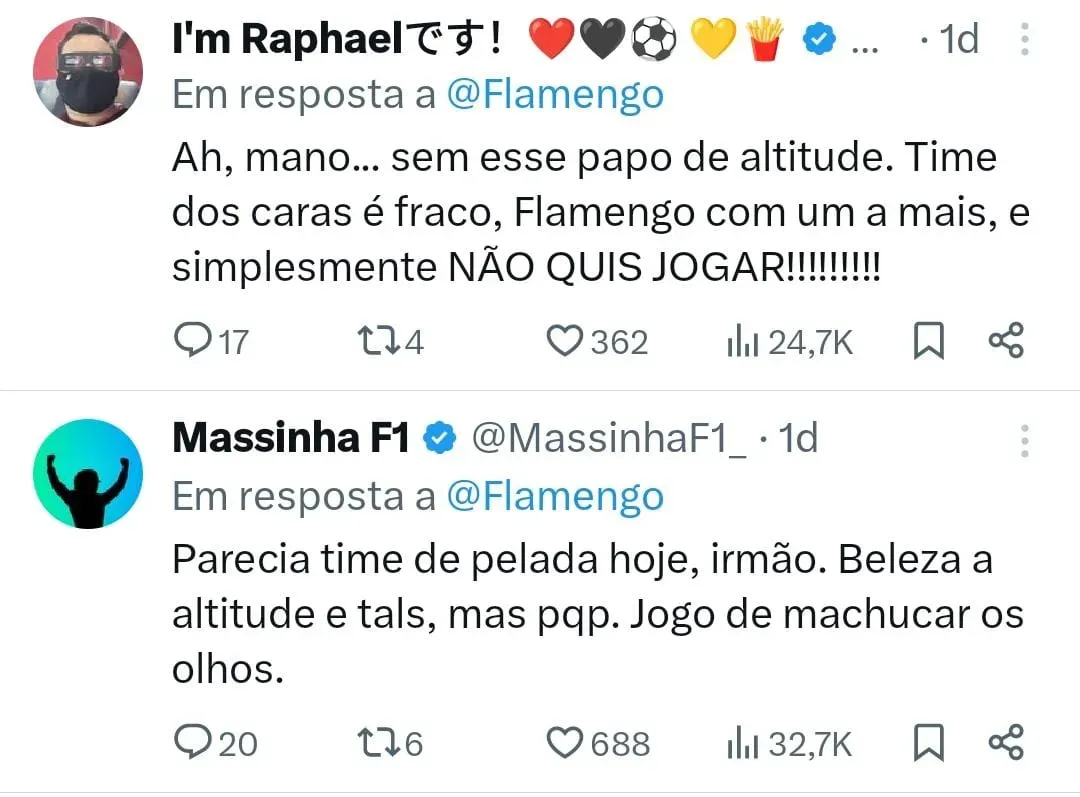 “O Tite sai com muitos erros. Se fosse aqueles joguinhos, ele estava lá em cima com o Campeonato Carioca e agora voltou algumas casas depois desse jogo. Não tem desculpa, é uma coisa incompreensível o que o Flamengo fez ontem. Ah, mas a altitude. A altitude de Bogotá é mole, o máximo que pode acontecer é a bola ficar mais rápida um pouco pelo ar mais rarefeito. Em termos de fôlego, não vi nenhum jogador do Flamengo sair exausto”, disse RMP criticando Tite.
