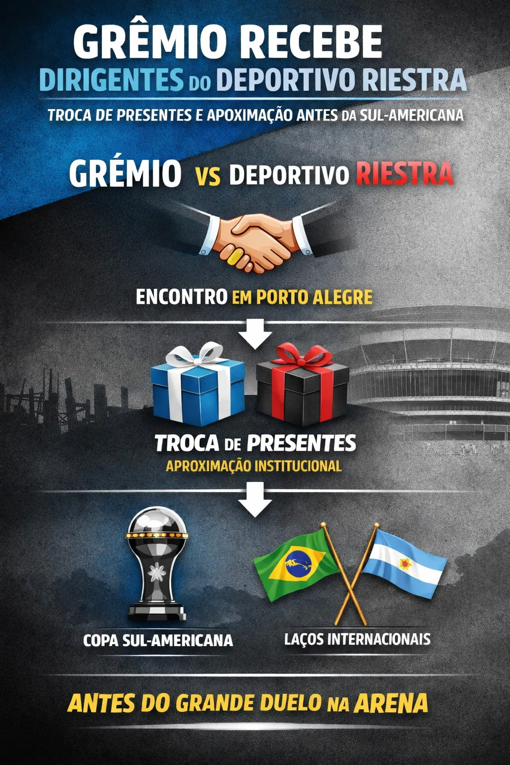O Grêmio protagonizou um movimento fora das quatro linhas ao receber oficialmente dirigentes do Deportivo Riestra, em Porto Alegre, na noite desta segunda-feira (13). Portanto, o encontro aconteceu poucas horas antes do confronto válido pela fase de grupos da Copa Sul-Americana, reforçando a relação entre os clubes.