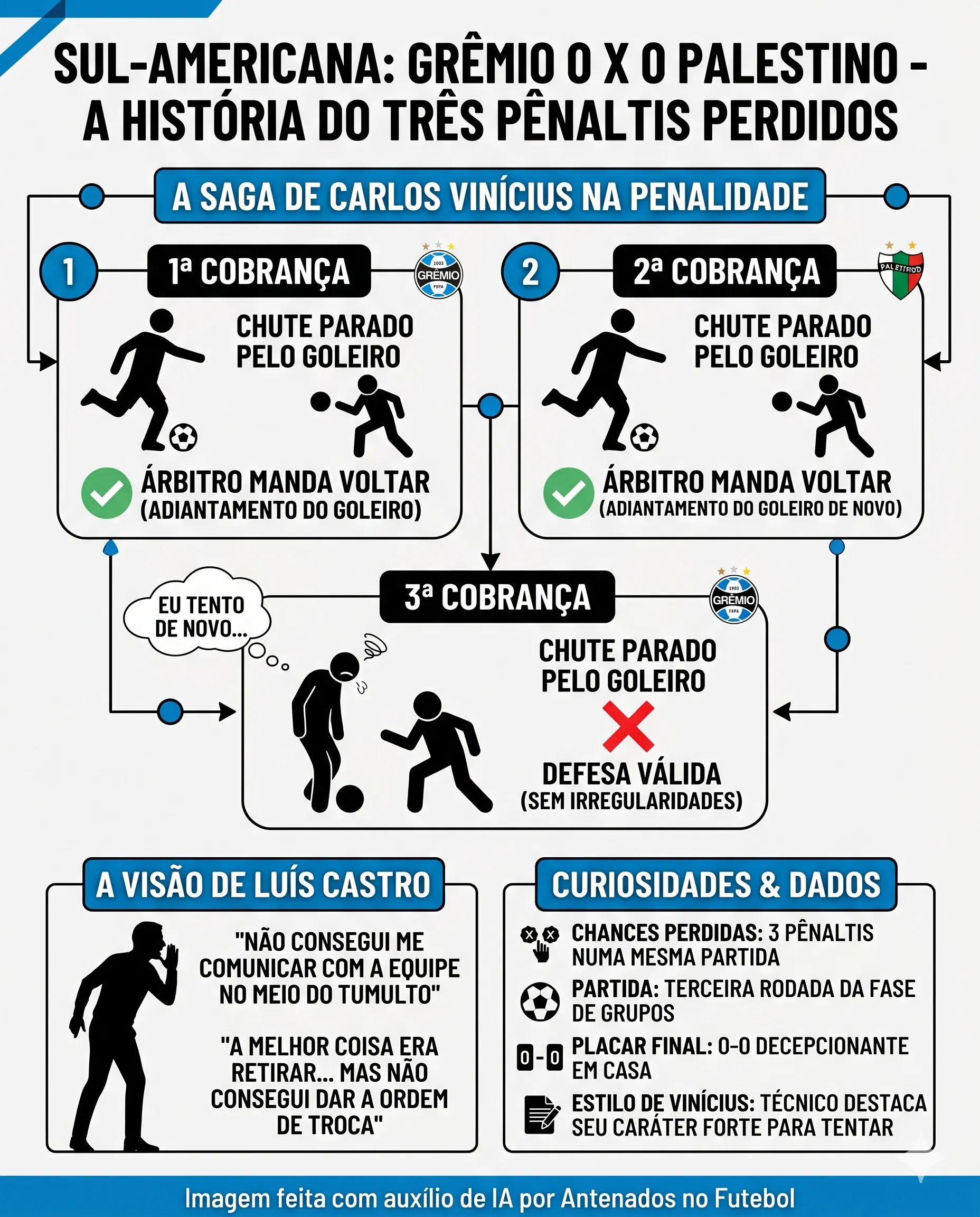 Na primeira cobrança, o árbitro mandou voltar após identificar adiantamento do goleiro. Na segunda tentativa, o chute foi defendido, mas novamente invalidado pelo mesmo motivo. Já na terceira cobrança, sem qualquer irregularidade, o goleiro voltou a defender e impediu o gol. Após a partida, o técnico Luís Castro comentou a situação e revelou que não gostaria que o jogador tivesse realizado a terceira cobrança.