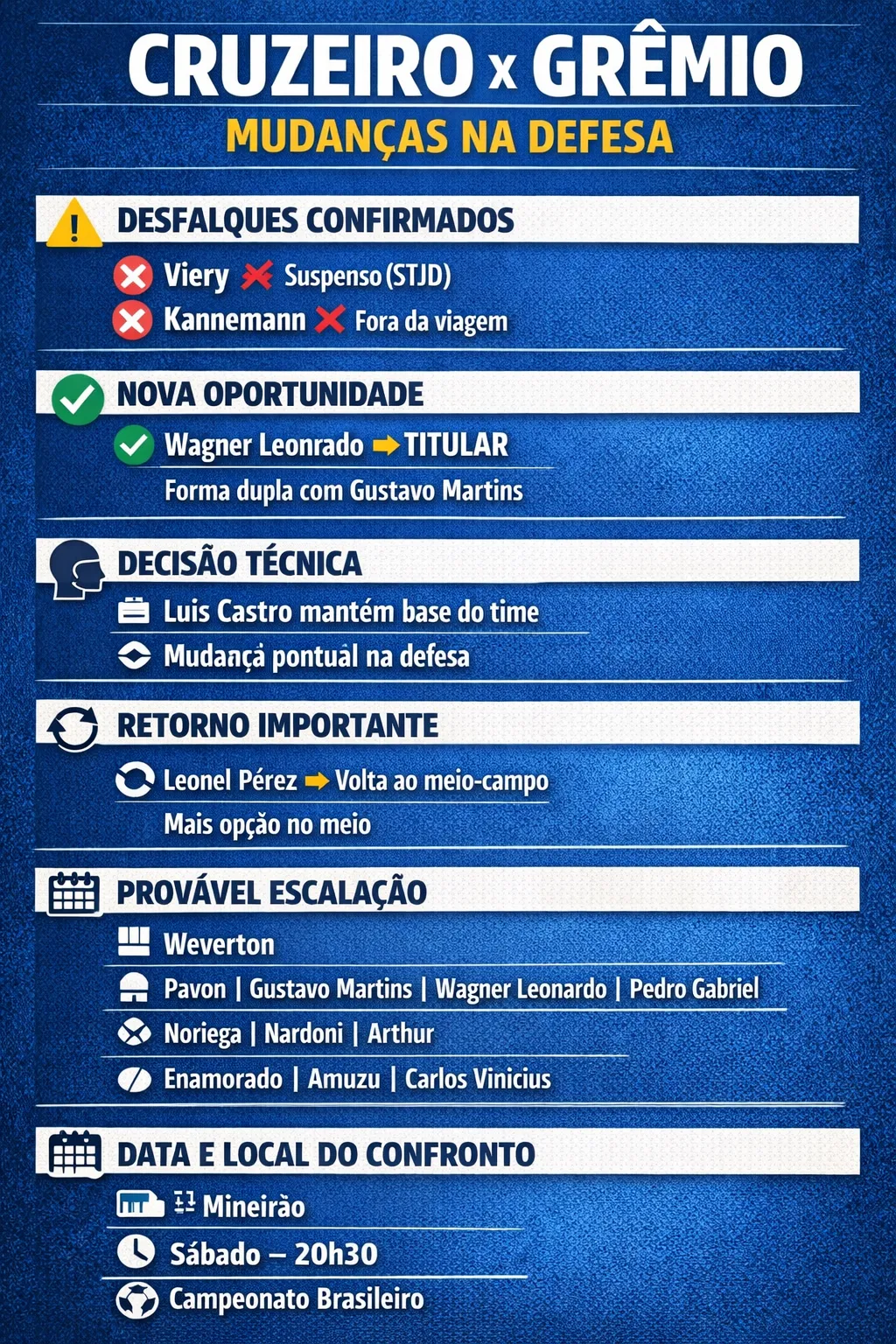 Contudo, a principal novidade envolve diretamente Wagner Leonardo. Com Viery suspenso após expulsão no Gre-Nal e Kannemann fora da viagem, o zagueiro ganhou a oportunidade e será titular na equipe comandada por Luís Castro.
