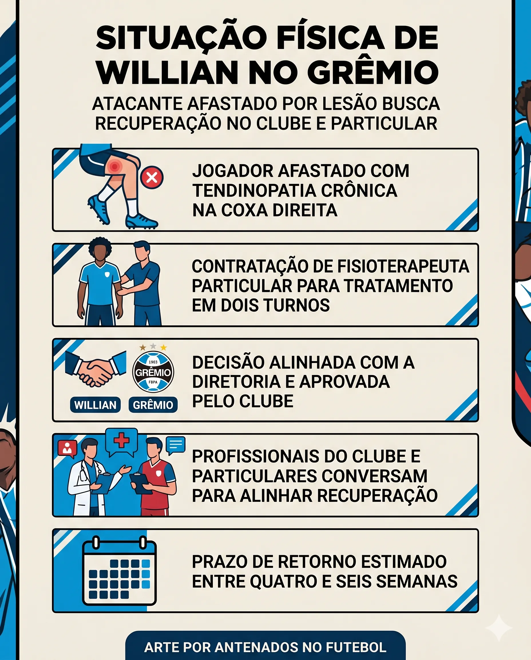 A decisão de Willian foi alinhada com a diretoria do Grêmio, que aprovou a iniciativa. O tratamento particular será complementar ao trabalho realizado no clube.