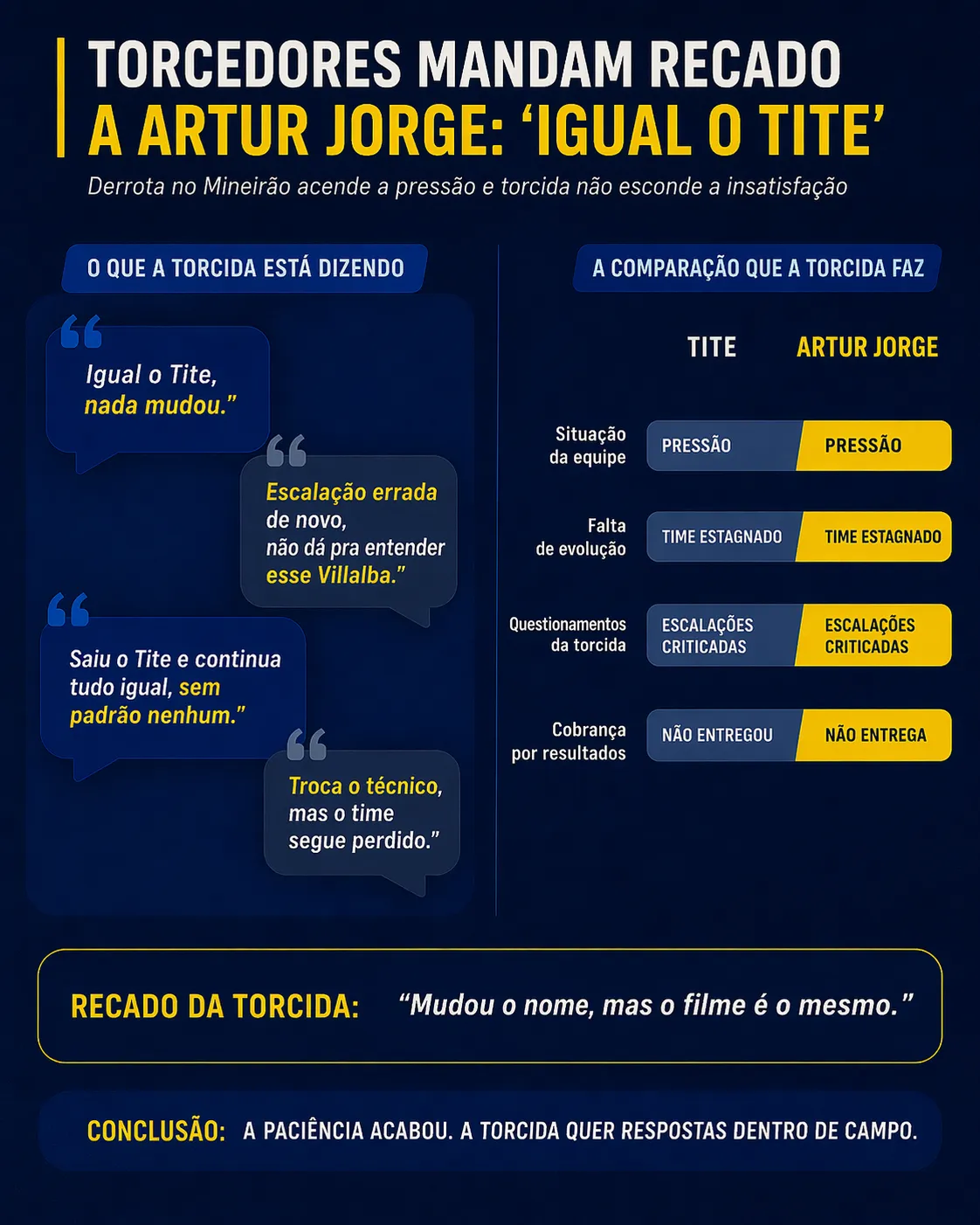 Após o apito final no Mineirão, o clima entre os torcedores do Cruzeiro ficou tenso e carregado de críticas direcionadas ao técnico Artur Jorge. A derrota por 2 a 1 para a Universidad Católica, pela Libertadores, foi o estopim para uma enxurrada de manifestações nas redes sociais. Entre elas, uma frase chamou atenção: “Igual o Tite, nada mudou”, refletindo a insatisfação com o momento da equipe.