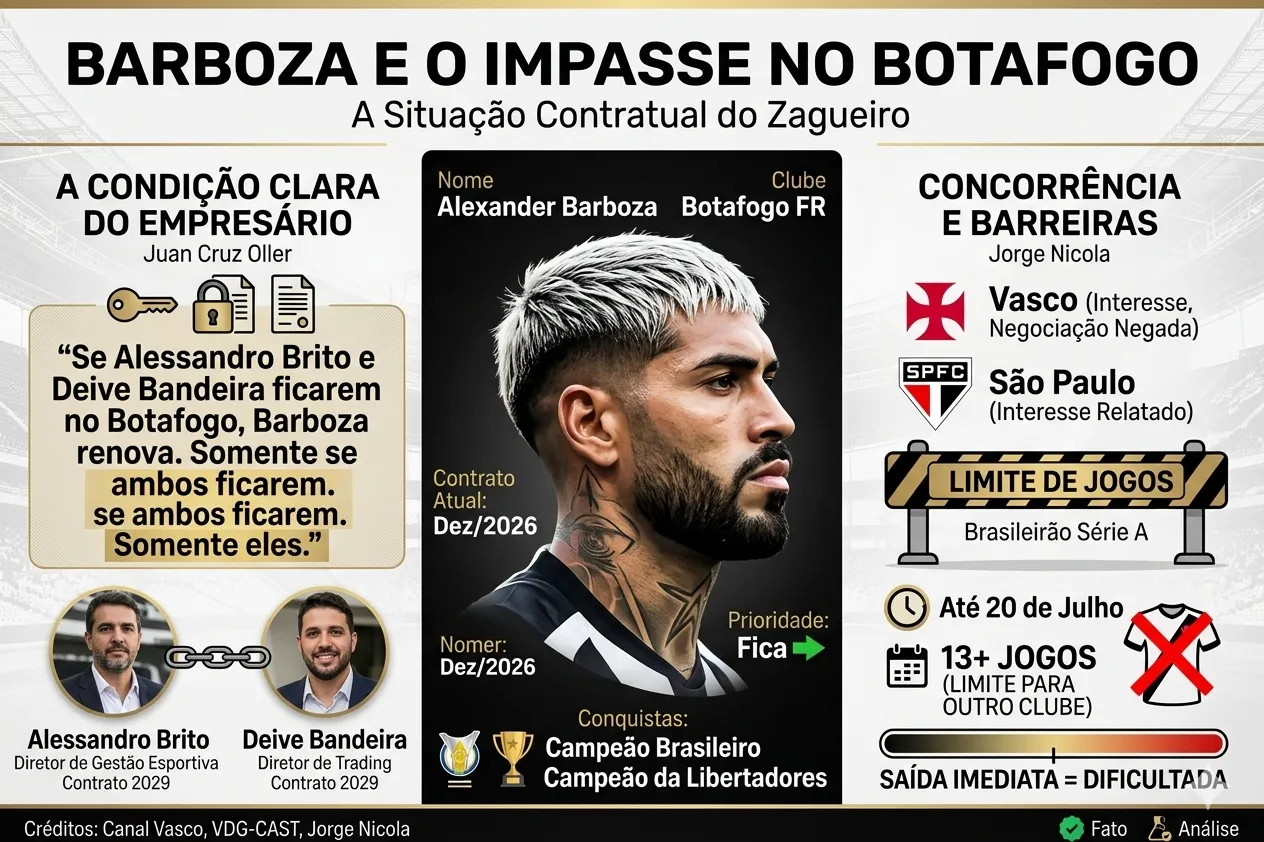 Alessandro Brito, diretor de gestão esportiva, e Deive Bandeira, diretor de trading, assinaram recentemente renovações com o Botafogo até 2029. A postura do empresário vincula o futuro de Barboza à estabilidade do projeto esportivo gerido pela dupla, que foi responsável pela montagem do elenco nas últimas temporadas.