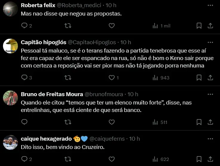 Por fim, o jogador renovou recentemente com o Fluminense e agora tem contrato com os cariocas até o final de 2025. No entanto, de acordo com a Itatiaia, Keno vê com bons olhos uma ida para o Cruzeiro.