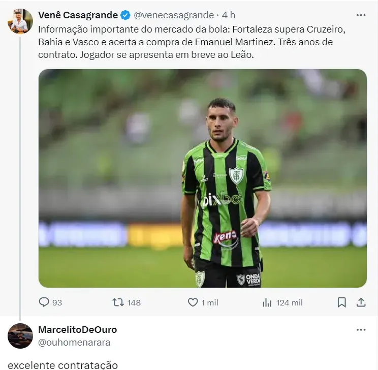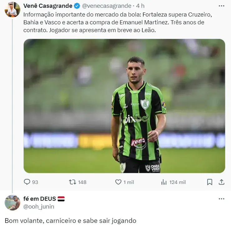 De acordo com informações apuradas pelo jornalista Venê Casagrande, especialista em mercado da bola no futebol brasileiro, Emmanuel Martínez, do América Mineiro, está fechado com o Fortaleza para a sequência de 2024.
