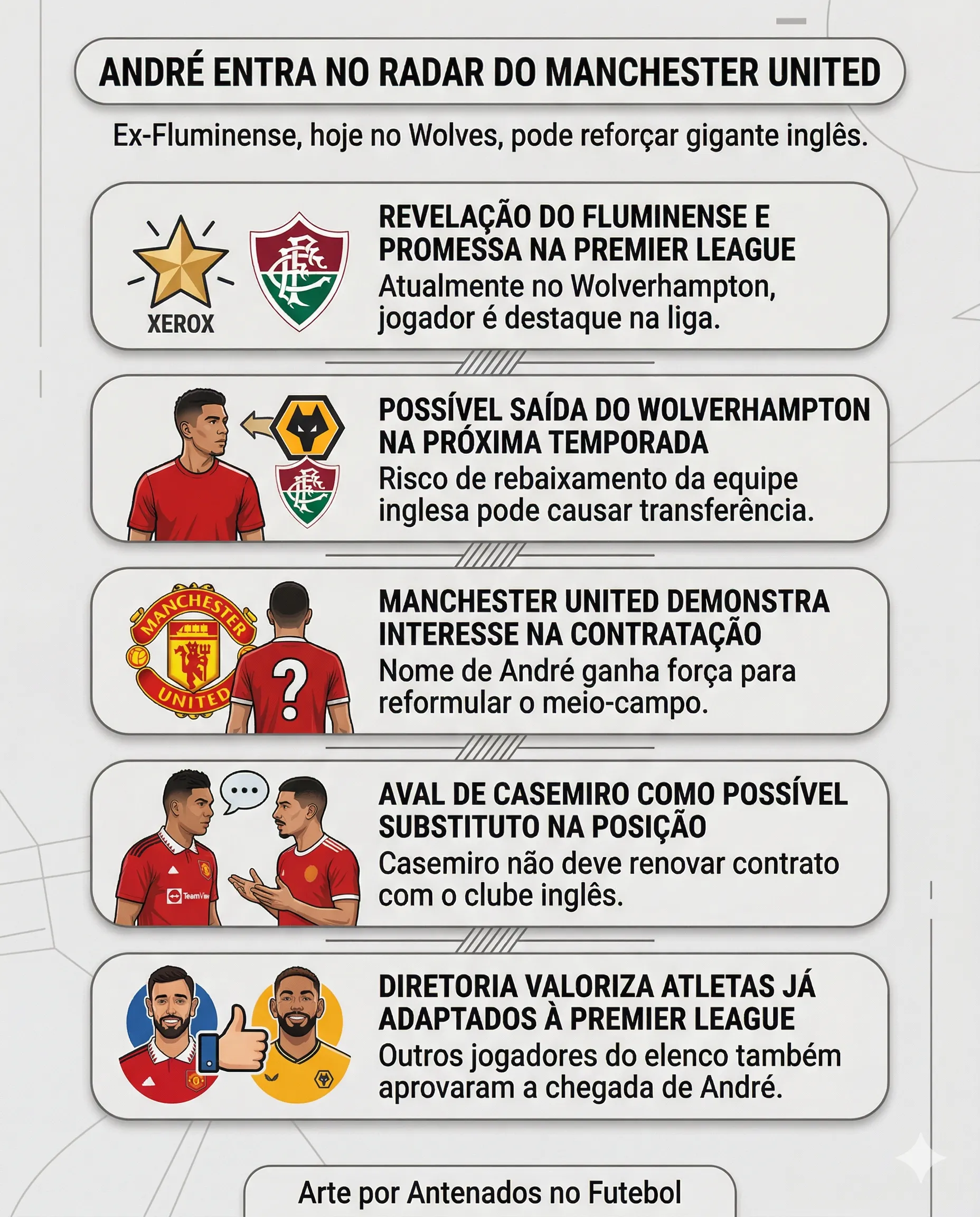 O nome de André ganhou força internamente no Manchester United como uma das opções para a reformulação do meio-campo. A movimentação conta, inclusive, com o aval de Casemiro, que enxerga o ex-Fluminense como um possível substituto para a sua posição.