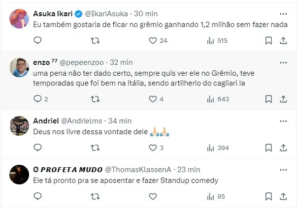 “Meu pensamento não mudou, a única coisa que importa é que o Grêmio vença. Meu contrato de empréstimo acaba em junho. Quando cheguei no Grêmio a intenção sempre foi ficar, assim como hoje. Nada mudou. Hoje meu foco é melhorar e conquistar coisas com o Grêmio. Vai ter o momento certo de sentar e pensar no futuro.” completou.