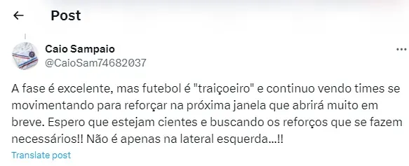 Voltando o papo para o restante da temporada, vale frisar que esse ‘começo’ de ano tem empolgado o torcedor, principalmente pelo bom futebol apresentado nos últimos jogos, mas a equipe sabe que ainda precisa de alguns reforços e ajustes para esse ano, com o atacante citado acima fazendo parte desse processo.