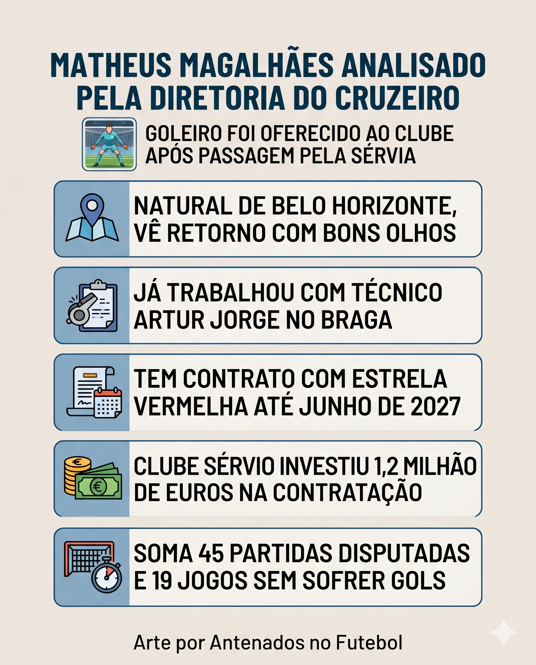 Nesse contexto, um nome passou a ser analisado pela diretoria celeste. Trata-se de Matheus Magalhães, que atua Estrela Vermelha, da Sérvia. De acordo com o portal Radar da Bola, o goleiro foi oferecido ao Cruzeiro.