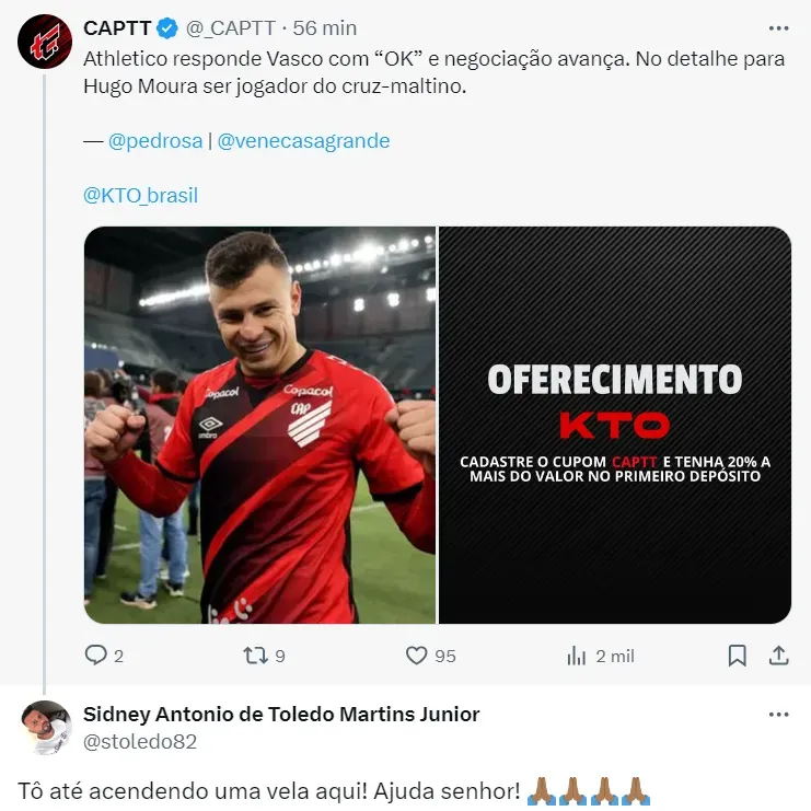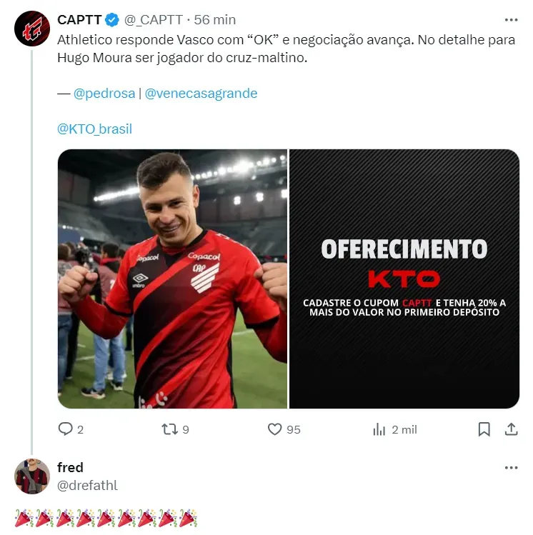 Mas outro assunto veio à tona nos bastidores: o mercado da bola. Ao que tudo indica, Hugo Moura pode interessa ao Vasco e pode deixar o Furacão. Agora, na tarde desta sexta, surgiu uma atualização sobre o assunto.
