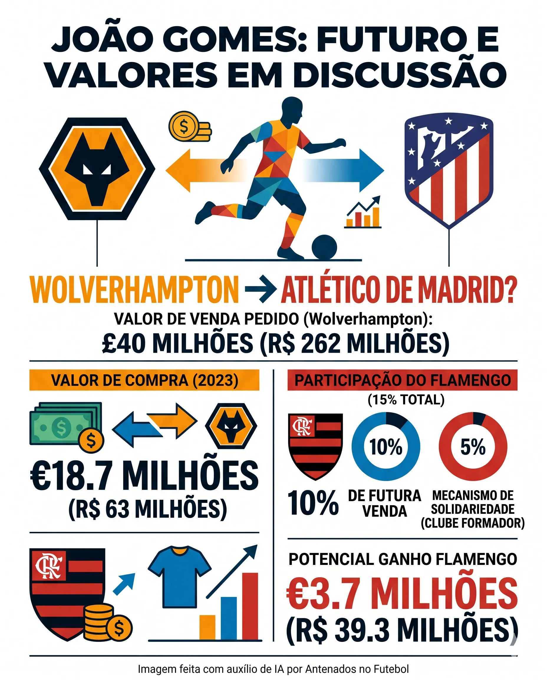 João Gomes foi contratado pelo Wolverhampton em 2023 por cerca de 18,7 milhões de euros (R$ 63 milhões na cotação da época), em negociação junto ao Flamengo. O Flamengo acompanha a situação de perto, já que pode ser beneficiado financeiramente em uma eventual transferência.