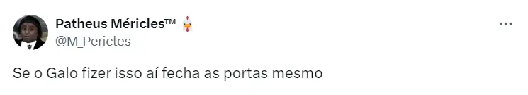 Segundo a fonte, neste momento, a situação está sendo discutida pelo departamento de futebol do Galo, que ainda tem dúvidas com relação ao seguimento da negociação e não mostra disposição seguir as conversas.