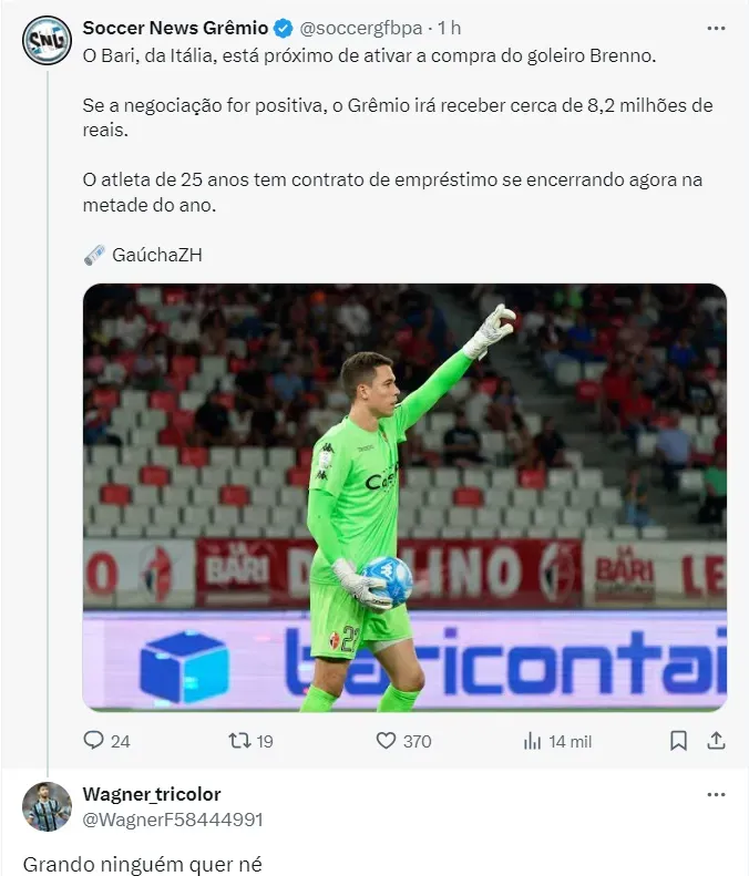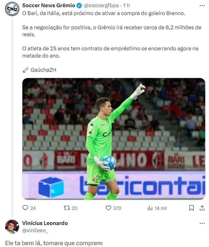 Apesar disso, outro assunto veio à tona nos bastidores: o mercado da bola. Ao que tudo indica, o Tricolor encaminhou o empréstimo de Rubens Ricoldi para um time da Série B. Além dele, outro jogador gremista que veio à tona foi Brenno, que está emprestado para o Bari, da Itália.