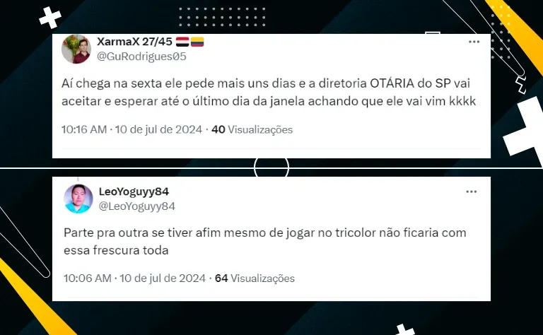 “O Patryck e o Riquelme, em caso de chegada do Alexsandro, são os jogadores que a gente aposta para compor com ele por uma questão de hierarquia. Isto se o Welington sair antes”, continuou o dirigente são-paulino.