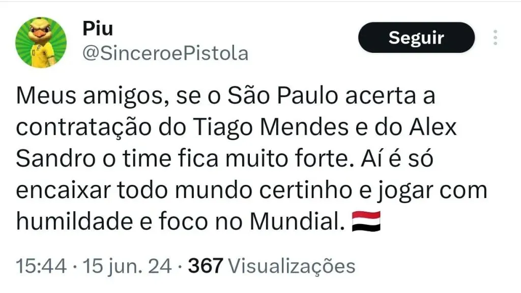 “Ele falou que está estarrecido com a torcida do São Paulo. Ele acompanha e tem família são-paulina. Ele falou sobre a média de 50 mil torcedores há três anos. O São Paulo perdeu e não teve problema. Estes jogadores que estão no exterior têm muita preocupação com violência no Brasil. O que aconteceu com o Willian (ex-Corinthians) repercutiu no mercado. Ele falou: ‘Vocês perderam e não teve nada. A torcida abraça o time o tempo inteiro’. Ele está acompanhando de perto o dia a dia do São Paulo.”, contou.