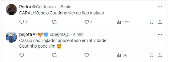 Nesta segunda-feira (6), segundo o jornalista Heverton Guimarães, da TV BAND Minas, a diretoria cruzeirense estaria interessada em Cássio, do Corinthians e Philipe Coutinho, que atualmente está no Al-Duhail, do Qatar.