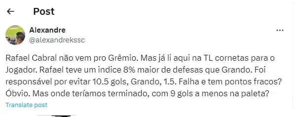 Entretanto, mesmo com a cabeça voltada para o duelo do BR24, outro assunto surgiu do nada para ‘agitar’ as alamedas do Rei de Copas: uma atualização envolvendo o mercado da bola. Isso porque, de acordo com o jornalista Thiago Fernandes, do Goal, a cúpula gremista está interessada no goleiro Rafael Cabral.