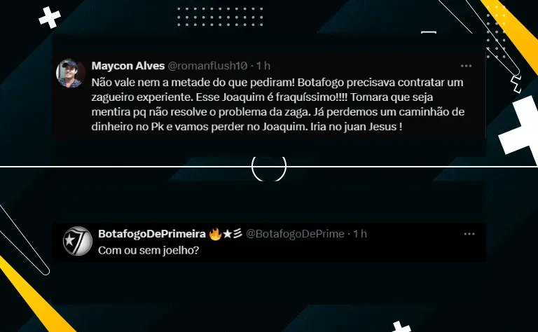 De acordo com o ge, o Fogão negocia a contratação do zagueiro, mas aguarda exames para avançar no negócio. Afinal, Joaquim tem sido desfalque do Santos por conta de uma lesão.