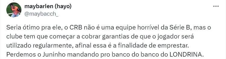 Neste ano, o meio-campista participou de oito jogos, marcou um gol e anotou uma assistência. O martelo do empréstimo ainda não foi batido, mas caso ele de fato saia, ganhará mais experiência no CRB, voltando ‘a todo vapor’ em 2025.