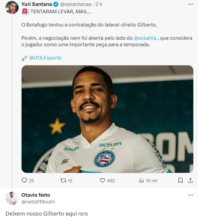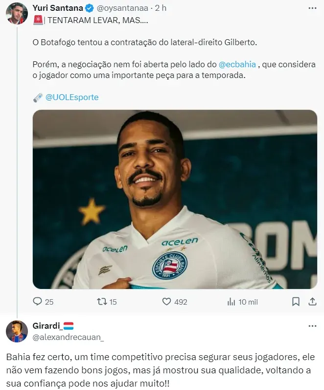 Em contrapartida, segundo a fonte, o Bahia não demonstrou interesse em negociar o lateral, deixando claro que conta com o jogador em seus planos para o futuro. Atualmente, ele é reserva de Santiago Arias.