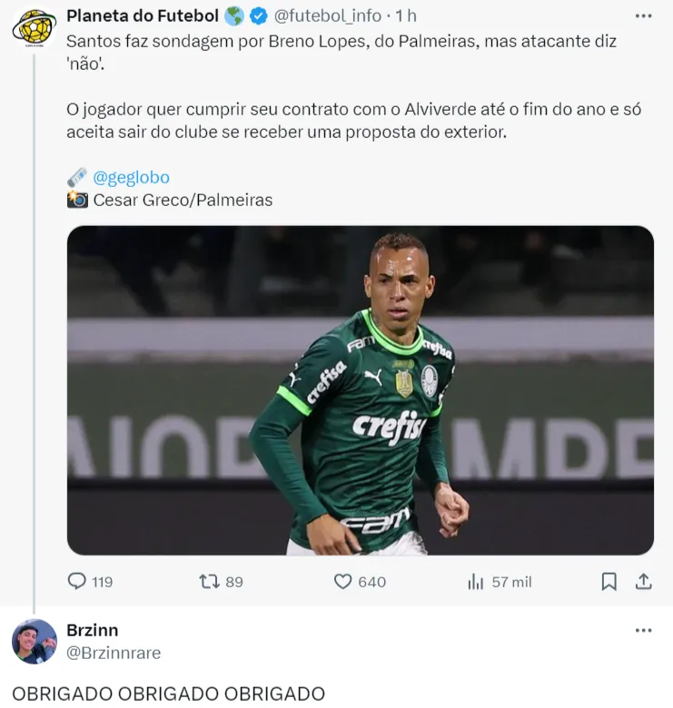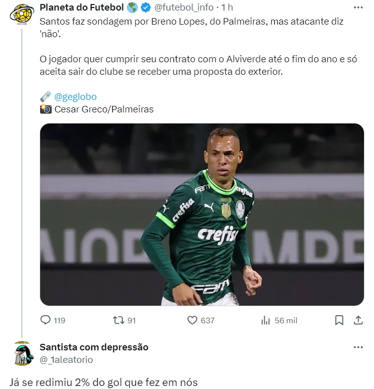 Porém, de acordo com informações apuradas pelo GE, o negócio não vai acontecer. Apesar da sondagem santistas, Breno Lopes disse ‘não’ ao Peixe, ele quer cumprir seu contrato com o Alviverde e só aceita sair se for para o exterior.
