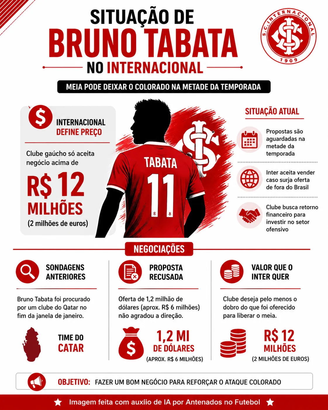 Nesta tarde de terça-feira (28), o assunto no Internacional é o futuro de Bruno Tabata. Isso porque, após algumas sondagens direcionadas ao seu staff no começo do ano, a direção aguarda uma proposta pelo ponta na metade da temporada.