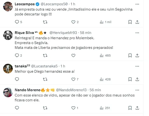 Nas redes sociais, os torcedores encheram de elogios o Cuiabano, que expressaram sua gratidão ao Grêmio pela contratação Além disso, a torcida fez um pedido a Artur Jorge para ser escalado como titular, substituindo Hugo, alvo de críticas frequentes.