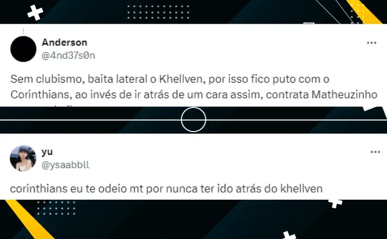 “Sem clubismo, baita lateral o Khellven, por isso fico maluco com o Corinthians, ao invés de ir atrás de um cara assim, contrata Matheuzinho reserva do Flamengo”. “Ele já brilhou pelo Furacão, seria um bom nome para assumir o setor direito“.