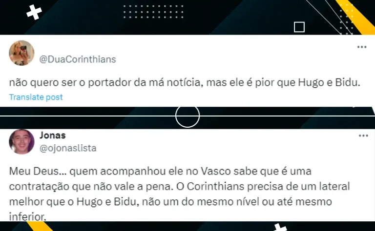 “Meu Deus… quem acompanhou ele no Vasco sabe que é uma contratação que não vale a pena. O Corinthians precisa de um lateral melhor que o Hugo e Bidu, não um do mesmo nível ou até mesmo inferior”. “Ele é bem ruim, espero que não venha”.