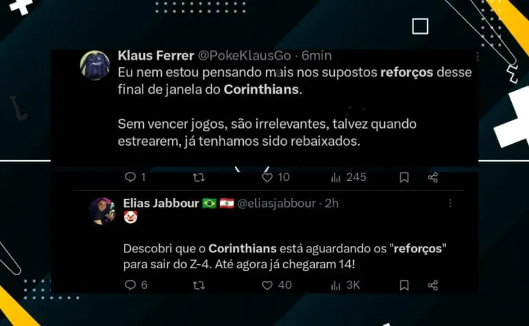 Além dos citados acima, é esperado que a diretoria do Timão também busque um lateral-esquerdo e um ponto, algo que é pretendido dentro do elenco para reforçá-lo ainda mais.