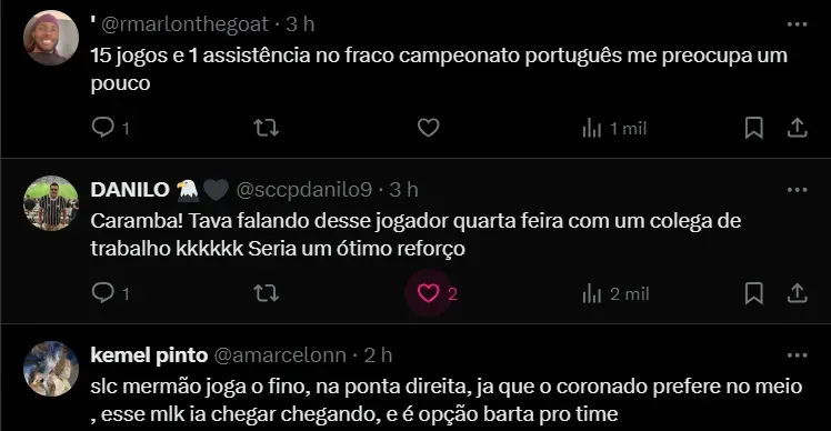 Além disso, o jornalista ainda trouxe que o meio-campista agrada ao presidente do Corinthians, Augusto Melo e a comissão técnica de António Oliveira, principalmente pela versatilidade. Dado que André Franco pode atuar no meio e também nas pontas.