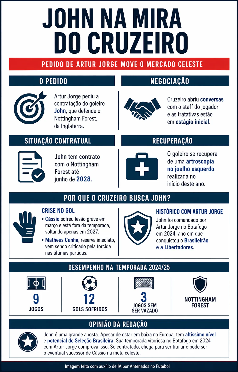 Na manhã desta terça-feira (21), o assunto no Cruzeiro é o goleiro John. De acordo com apuração da ESPN Brasil, o técnico Artur Jorge pediu a contratação do arqueiro de 30 anos que defende o Nottingham Forest, da Inglaterra.