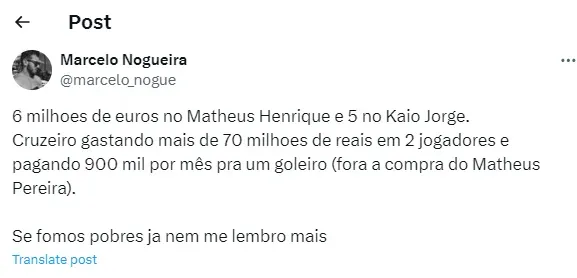 “O Cruzeiro é considerado a principal opção para o jogador neste momento. Há, inclusive, outros clubes brasileiros que demonstraram interesse pelo atleta e tiveram uma sinalização sobre as conversas positivas com a diretoria celeste”, frisou o site.