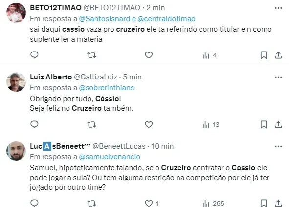 “Esquentou. O Cruzeiro entrou em contato com Carlos Leite, representante do Cássio. Discutiram valores, e o Cruzeiro estuda se vai fazer proposta ou não”.
