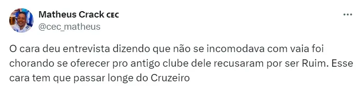 Leia mais: Fernando sofre lesão e retorno ao Cruzeiro é adiado após pedidos da torcida