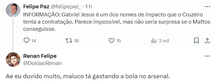 Agora, a diretoria busca novos alvos no mercado e quer um ‘nome de impacto’. Sendo assim, de acordo com informações apuradas por Felipe Paz, o Cabuloso está tentando a contratação de Gabriel Jesus, do Arsenal.