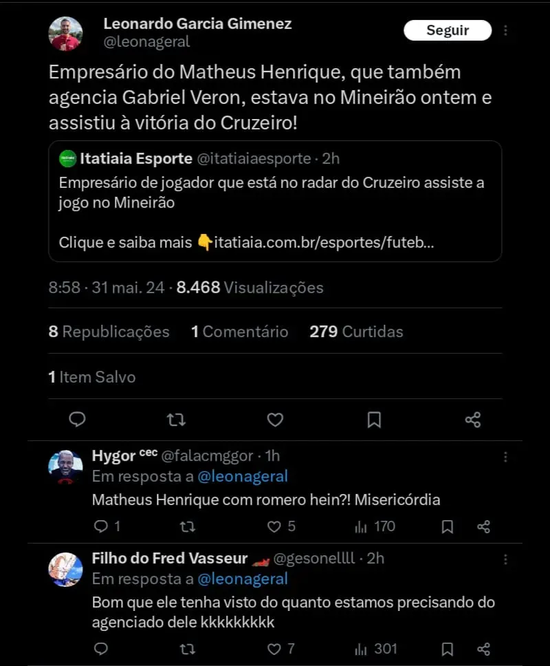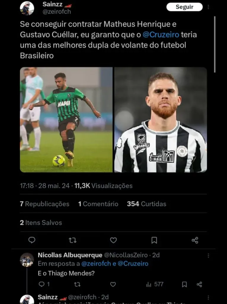 Segundo informado pela Itatiaia, o nome de Matheus Henrique agrada e muito à diretoria cruzeirense. Pedro Lourenço, dono da SAF do Clube, também vê o atleta com bons olhos.