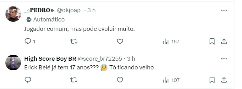 Erick Belé já acumula uma impressionante marca de 20 gols em 38 jogos disputados pela categoria sub-17, o que chamou a atenção da comissão técnica e o levou a ser promovido para a equipe sub-20. No novo patamar, o meia contribuiu para a conquista do título do Paulistão e teve participação na última edição da Copinha.