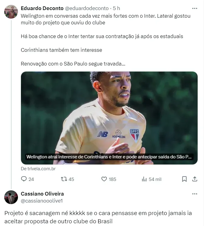 Inclusive, os números apresentados pela diretoria do time gaúcho são de agrado do lateral. Vale lembrar que Welington possui contrato somente até o fim deste ano, portanto, pode assinar um pré-acordo a partir da metade de 2024.