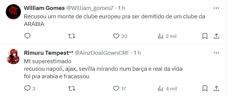 Nas redes sociais, os torcedores ficaram animados, uma vez que Gallardo já foi alvo do clube carioca em algumas oportunidades. Sua demissão pode fazer sombra para Tite.