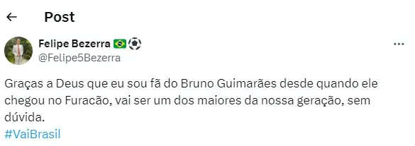 Todavia, mesmo com a cabeça voltada para o próximos jogos, nesta quarta-feira (29), outro assunto chegou nos bastidores do Maior do Paraná: uma atualização envolvendo um jogador que já passou pelo nosso clube, o meio-campista Bruno Guimarães.