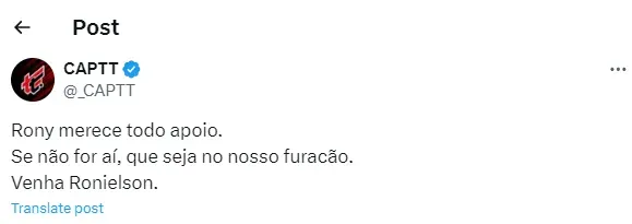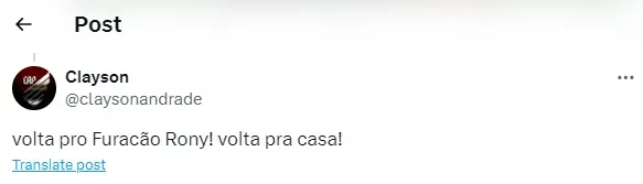 Todavia, mesmo ainda lamentando o revés, outro assunto segue agitando os bastidores do Furacão : a situação de um ex-atacante da equipe, Rony. Renegado pela torcida do Palmeiras, nas últimas horas, o centroavante tomou uma decisão sobre seu ‘futuro’.
